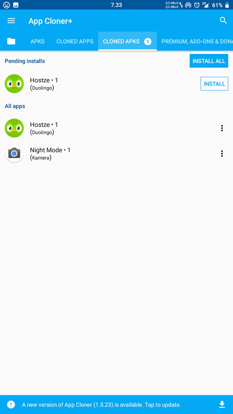 App Cloner Premium & Add-ons Mod: 100% working on 138,846 devices, voted by 36, developed by App Listo. This mod is an alpha version of the app Cloner. features: All unlocked Premium Subscriptions No ads. App Cloner Premium & Add-ons Mod Apk 6.0.0 [Remove ads][Unlocked][Premium] size:15.05 MB. 100% working on 138,846 devices. 3.5. Click on the above link to download App Cloner mod APK. 2. Save the file in your device Downloads folder. 3. Now tap on Install and wait for the installation to finish.. Slugterra: Slug it Out 2 Mod Apk 5.0.2 [Unlimited money] FR Legends Mod Apk 0.3.3.1 [Unlimited money] My Talking Angela 2 Mod Apk 2.0.2.19043 [Unlimited money].